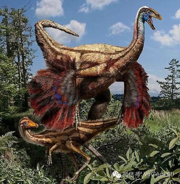 近几年研究显示,有些恐龙身覆羽毛,虽然它们并不会飞。图为长羽毛的似鸟龙的概念图。