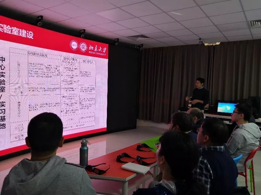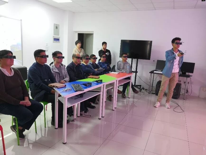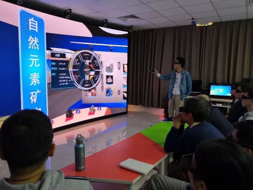 首先熊老师为到访的各位老师介绍了沉浸式虚拟仿真实验室的总体情况,包括主要实验设备、运营管理及日常的教学安排等。接着于鑫助教为各位老师展示了“地质博物馆”和“灰峪地质实习”案例,来访老师佩戴3D眼镜体验了实验效果。