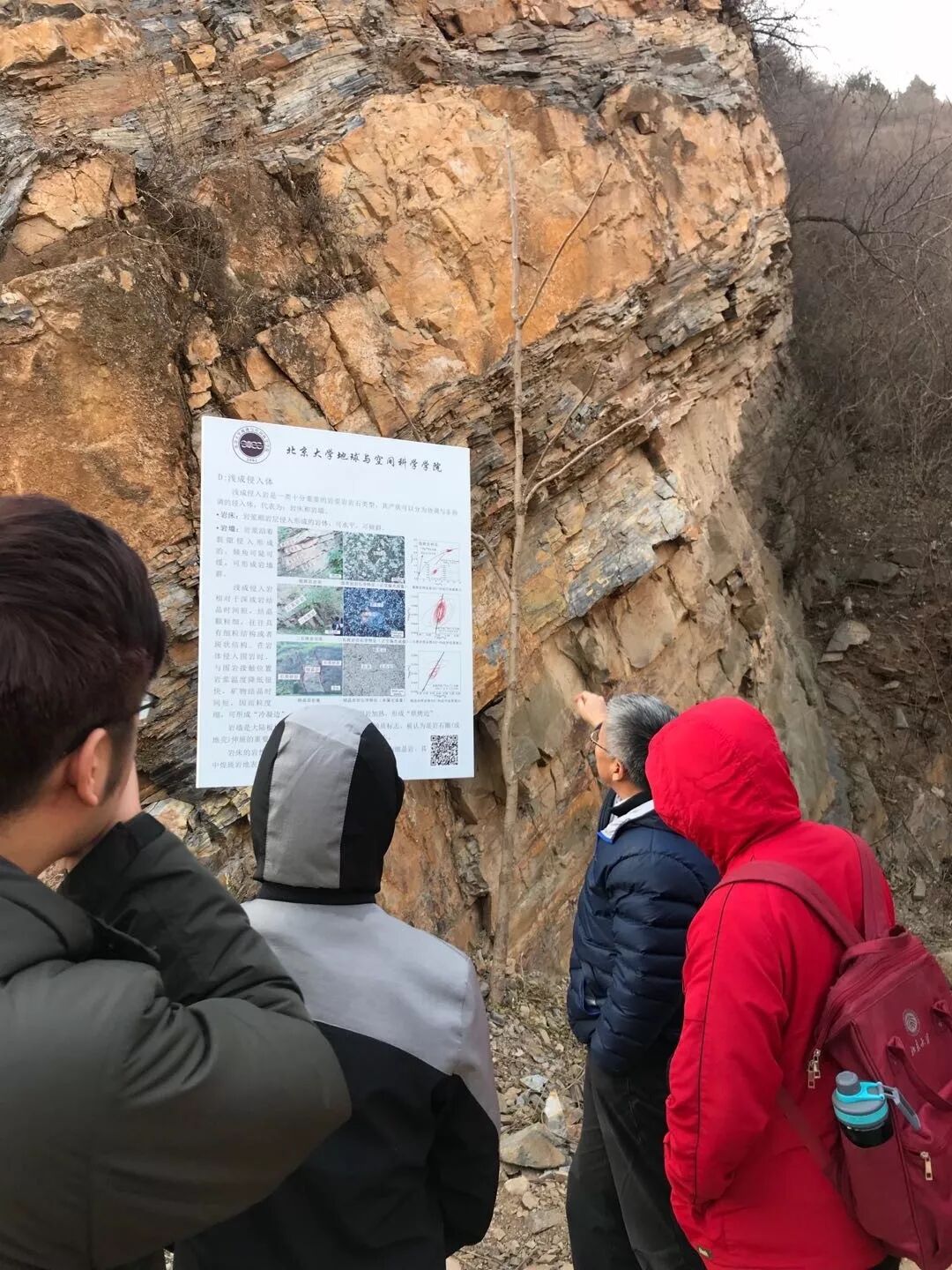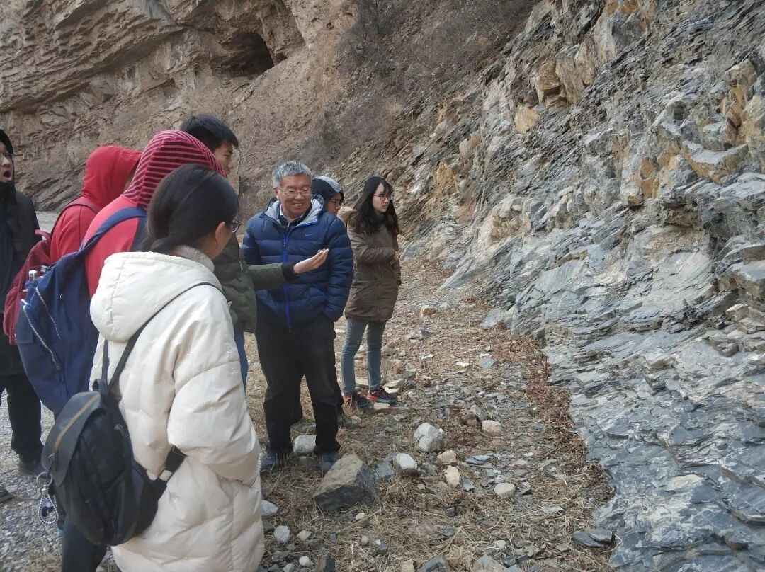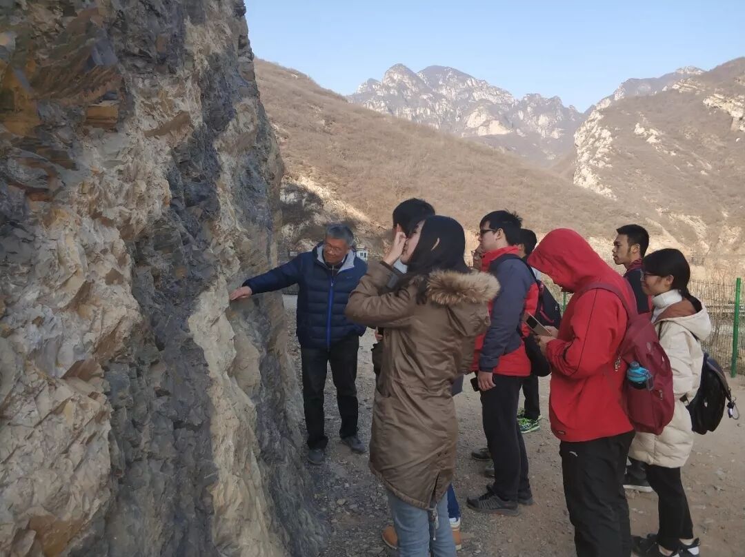 虎峪自然风景区不仅是国家2A级旅游景点,更有着丰富的地质构造现象供同学们观察学习。在虎峪沟内近2km的观察路线上,一路由张志诚教授生动讲解,没有地质学基础的各个院系的同学们通过9个观察点的观测,了解到古老地球的活动、地表岩石的形成等。