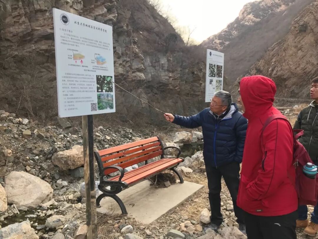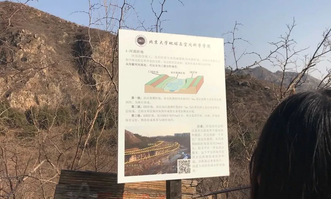 讲解指示牌——虚拟仿真中心在虎峪每个观察点都设立了讲解指示牌,用以辅助老师们上课,便于同学们理解。通过扫描图板中的二维码,可以看到相关知识点更多的介绍,为野外实习提供了有益的补充。
